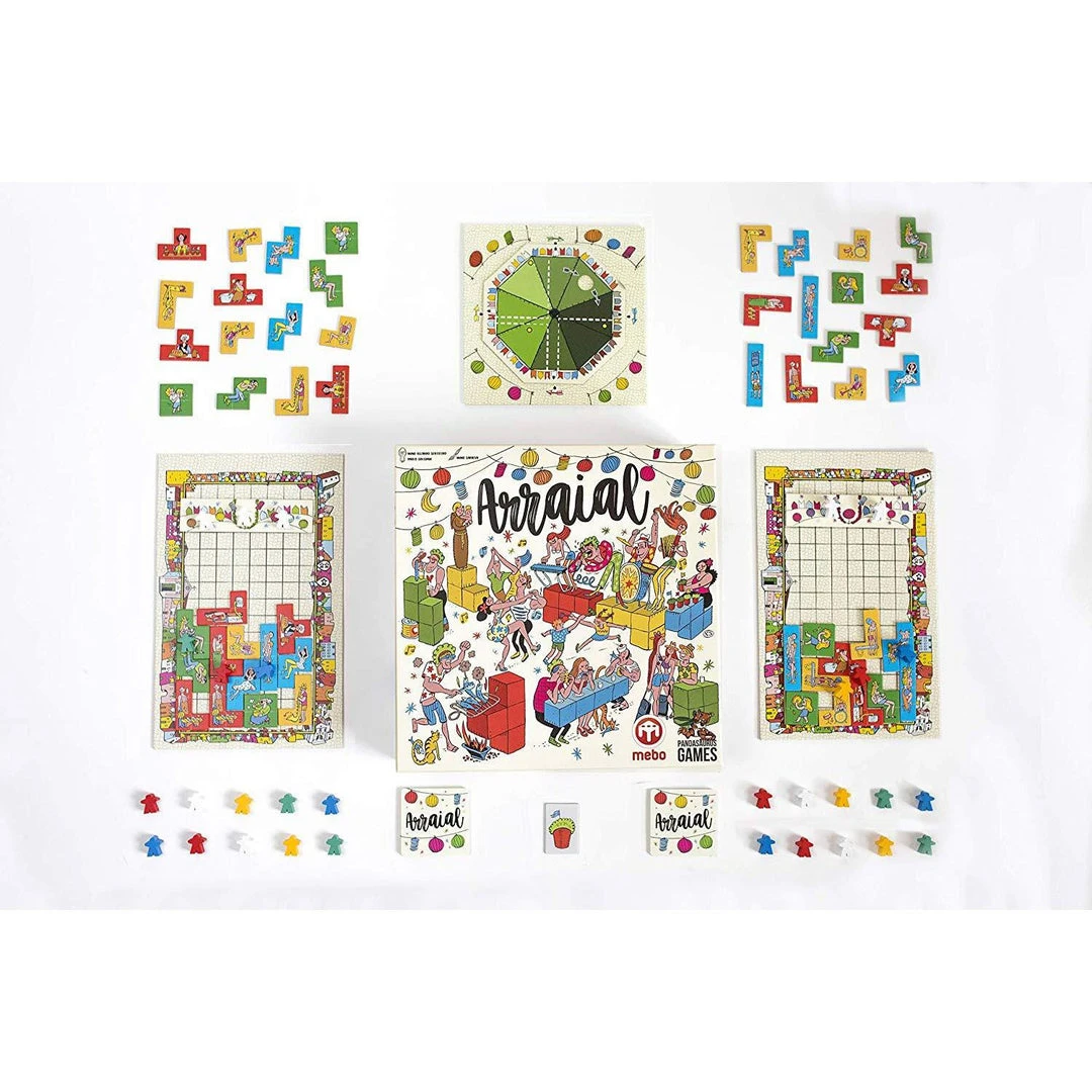 “Arraial” is the name given to traditional Portuguese summer celebrations during which people take to the streets eating, drinking, and having fun in the old neighbourhoods that are bedecked with arches, colourful balloons, popular music, and the aroma of sweet basil. In the game Arraial, players try to make their neighbourhood traditional event the most popular by attracting visitors to their celebration. Grab the most beautiful decorations, hire the most inspired performers, serve the most traditional delicacies, take to the streets, and host the party of the year! Arraial is a fast-paced game in which players take turns spending action points to get the best tiles (decorations, artists…) and place them on their player boards to form the perfect match and attract visitors to their party. In the end, whoever attracts the most visitors in their neighborhood wins.