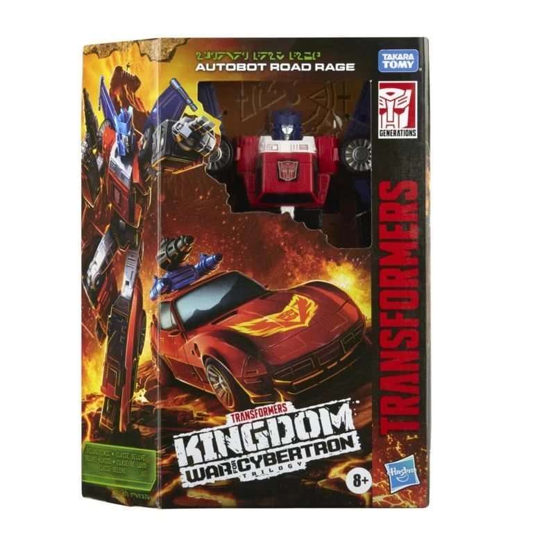 Beastify the battlefield! Worlds collide when the Maximals and Predacons join the fight, coming together with the Autobots and Decepticons in an epic battle that will alter their destiny forever. With the ancient and highly advanced F.O.S.S.I.L. (Fossilized Osteo-Skeletal Shield Integration Loadout) technology, Fossilizer bots, infused with primordial energy, break apart to weaponize their allies. Use Deluxe Fossilizer figures to beastify the Autobot Road Rage figure with bone armor! (Sold separately, subject to availability.) This G1-inspired toy converts into sportscar mode in 21 steps. Convert from sportscar mode to flying car mode in 8 steps. Comes with blaster accessory and missile launcher accessory that attaches behind figure’s shoulders in robot mode. Blaster and missile launcher accessory combine to form triple-barrel blaster accessory that attaches to the figure in flying car mode! Transformers and all related characters are trademarks of Hasbro Includes Transformers Generations War for Cybertron: Kingdom Deluxe Class Autobot Road Rage figure, 2 accessories, and instructions.